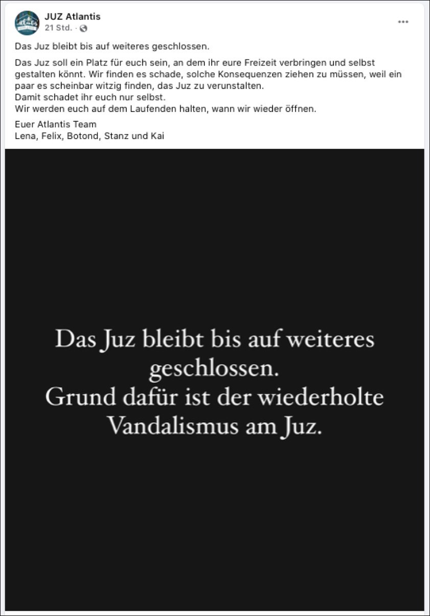 Wie auf der Facebook-Seite der städtischen Einrichtung bekannt gegeben wurde, bleibt das Jugend-Zentrum (JUZ) "Atlantis" "bis auf weiteres geschlossen". Grund dafür sei "der wiederholte Vandalismus am JUZ", heißt es unmissverständlich in dem Post (siehe Screenshot unten). Das "Atlantis"-Team erklärt außerdem:"Das JUZ soll ein Platz für euch sein, an dem ihr eure Freizeit verbringen und selbst gestalten könnt. Wir finden es schade, solche Konsequenzen ziehen zu müssen, weil ein paar es scheinbar witzig finden, das JUZ zu verunstalten. Damit schadet ihr euch nur selbst. Wir werden euch auf dem Laufenden halten, wann wir wieder öffnen."