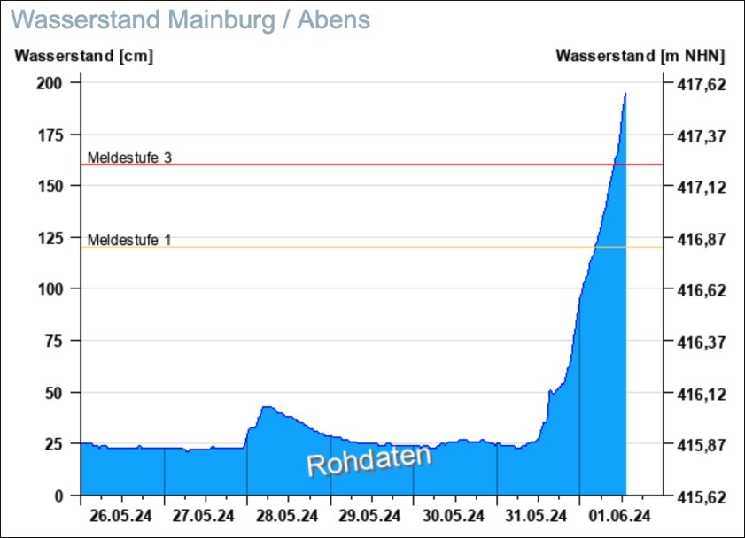 Der Abens-Pegel in Mainburg schnellte regelrecht in die Höhe (Grafik: HND Bayern).