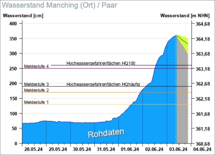 Paar-Pegel in Manching: Blau die jüngste Entwicklung; gelb der Unsicherheits-Bereich der Vorhersage (Quelle: HND Bayern)