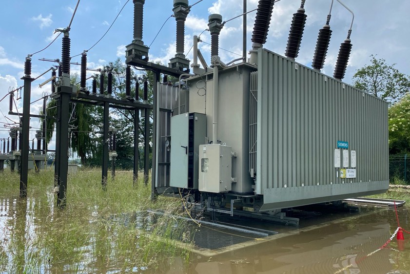 Situation am Sonntag: Transformator im überfluteten Umspannwerk in Reichertshofen. Die Anlage musste vom Netz genommen werden, es kam zu Versorgungs-Unterbrechungen.