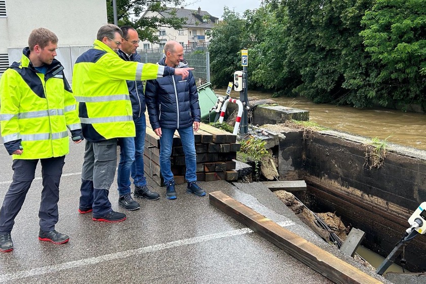Bayernwerk-Vorstand-Chef Egon Leo Westphal (rechts), Bayernwerk-Netz-Geschäftsführer Joachim Kabs (Zweiter von rechts) und Regional-Leiter Sebastian Biegel (Dritter von rechts) machten sich heute auch ein Bild von den Hochwasser-Folgen am Unternehmens-Standort in Pfaffenhofen.