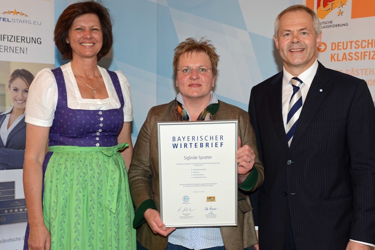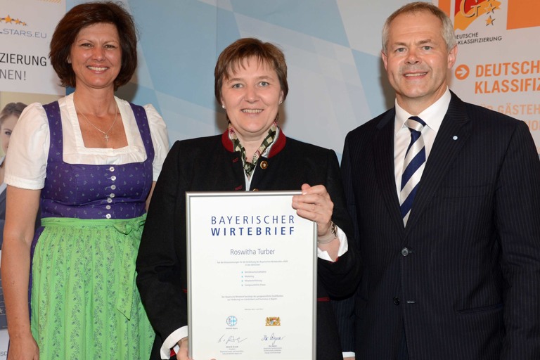 (ty) Aus den Händen von Staatsministerin Ilse Aigner und DEHOGA-Präsident Ulrich N. Brandl wurde im Bayerischen Staatsministerium für Wirtschaft und Medien, Energie und Technologie der bayerische Wirte- und Unternehmerbrief an Siglinde Spratter vom „Hallertauer Schmankerlteam“ aus Niederlauterbach und Roswitha Turber vom „Hofcafe Ilmtaferne“ in Geisenfeld verliehen. Nach Abschluss eines Seminars konnten die beiden neben weiteren 27 Berufskolleginnen und -kollegen diese Auszeichnung entgegennehmen.