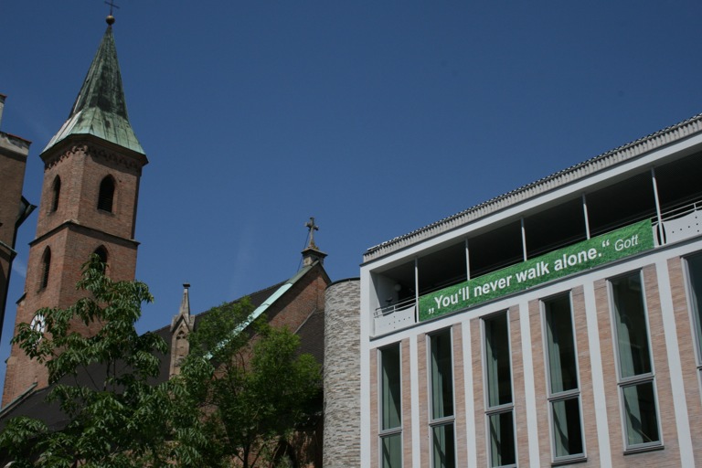 Auch mit dem Slogan „Ich liebe Dich. Gott“ hatte das Dekanat zuvor schon Passanten im Vorbeigehen angesprochen und neugierig gemacht, berichtet Dekanin Schwarz. Wenn man von der Ingolstädter Fußgängerzone auf das evangelische Gemeindezentrum zulaufe, erschließe sich hier der Text Wort für Wort zu dem vollständigen Satz. „Immer wieder stehen Passanten dann vor dem Gemeindezentrum, fotografieren die Banner mit dem Handy und versenden die Botschaft an Freunde oder Bekannte: „You’ll never walk alone. Gott“