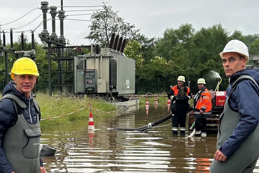 Foto vom vergangenen Montag: Bayernwerk-Vorstands-Chef Egon Leo Westphal (links) und Bayernwerk-Netz-Geschäftsführer Joachim Kabs (rechts) machten sich ein Bild vom überfluteten Umspannwerk in Reichertshofen.