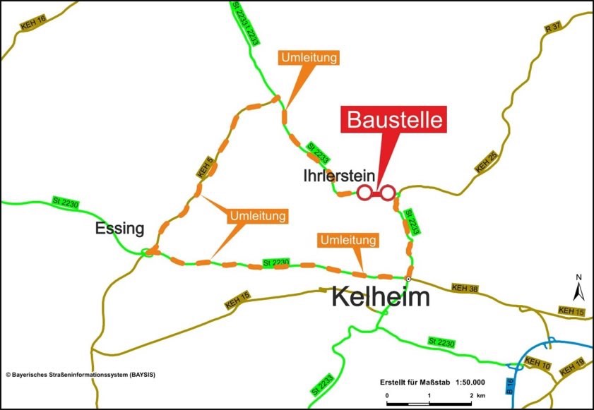 Die Strecke zwischen Kelheim und Sinzing/Alling über die KEH25 bleibt der Behörde zufolge befahrbar. Die Umleitung erfolgt von Ihrlerstein aus nördlich in Richtung des Ortsteils Walddorf über die Staatsstraße 2233 und im Weiteren in Richtung Essing auf der Kreisstraße KEH5 und anschließend auf der Staatsstraße 2230 in Richtung Kelheim. Analog dazu für die Umleitung in Gegenrichtung. Für den zweiten Bauabschnitt, der fürs kommende Jahr geplant ist, sind nach Angaben der Behörde noch Baugrund-Untersuchungen nötig.