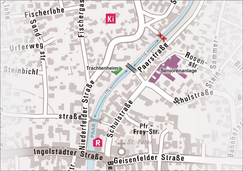 Auf der Karte ist der bisherige, alte Steg rot mit "XX" gekennzeichnet. 115 Meter südlich davon soll die zweite Paar-Brücke entstehen. Weitere 170 Meter südlich befindet sich der Übergang für Fußgänger und Radler am Rathaus.