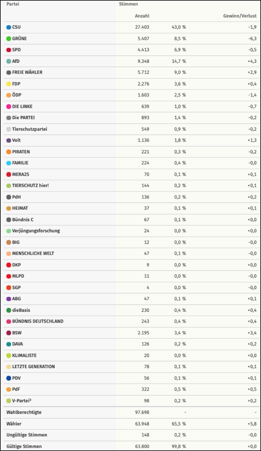 Während also die CSU genau 43 Prozent (minus 1,9 Punkte) einfuhr und die AfD 14,7 Prozent (plus 4,3 Punkte) verbuchte, blieben für die Grünen nur mehr 8,5 Prozent (minus 6,3 Punkte). Die Freien Wähler verbesserten sich um 2,9 Prozentpunkte auf nunmehr 9,0 Prozent, während die SPD ein kleines Minus von 0,5 Punkten auf jetzt 6,9 Prozent zu verkraften hat. Die FDP legte leicht um 0,4 Punkte zu und kam auf 3,6 Prozent, die ÖDP verlor 1,4 Punkte und landete bei nur mehr 2,5 Prozent. Das noch recht junge "Bündnis Sahra Wagenknecht" (BSW) erhielt im Landkreis 2195 Stimmen und kam hier aus dem Stand auf 3,4 Prozent.