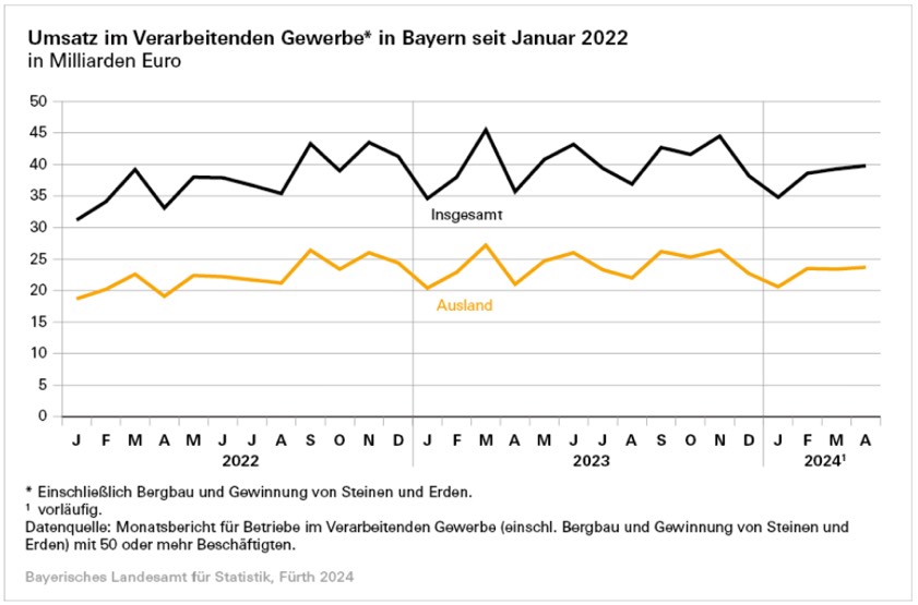 (ty) Im April dieses Jahres hat das verarbeitende Gewerbe im Freistaat ein Umsatz-Plus von nominal 11,4 Prozent gegenüber dem Vorjahres-Monat verzeichnet – und zwar auf rund 39,8 Milliarden Euro. Das verarbeitende Gewerbe, bezogen auf Betriebe mit 50 oder mehr Beschäftigten, umfasst dabei auch immer den Bergbau und die Gewinnung von Steinen und Erden. Wie das bayerische Landesamt für Statistik weiter mitteilt, entfielen von den 39,8 Milliarden Euro des Gesamt-Umsatzes rund 23,7 Milliarden Euro auf Umsätze mit dem Ausland (plus 12,6 Prozent) und darunter rund 7,7 Milliarden Euro auf Umsätze mit den Ländern der Euro-Zone (plus 9,1 Prozent).