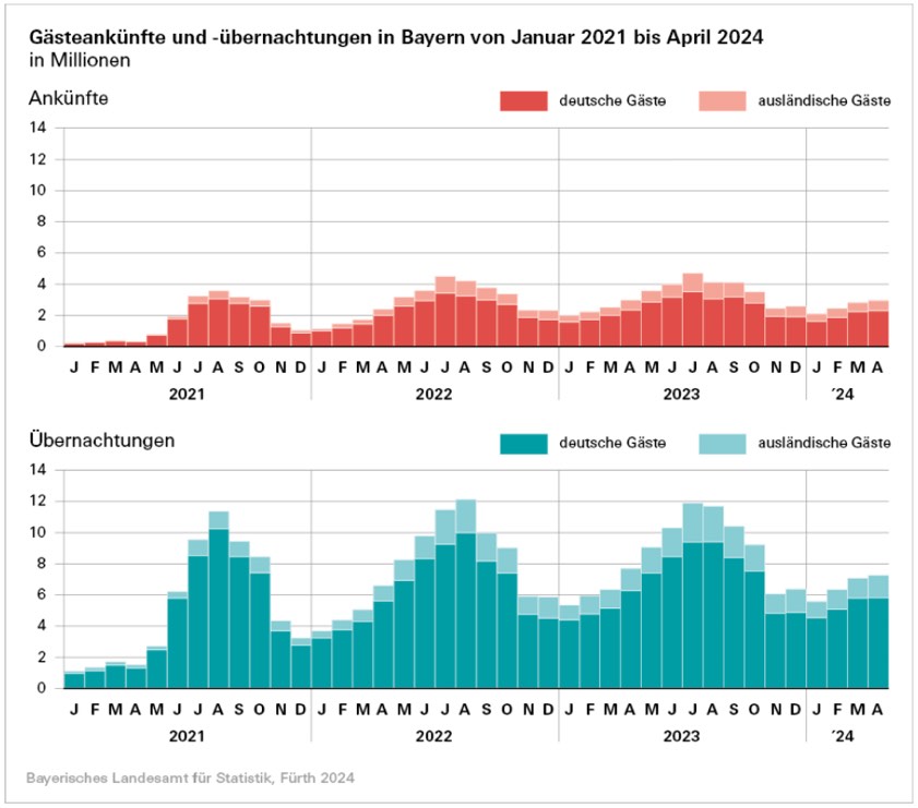 Die gut 10,3 Millionen Gäste-Ankünfte und knapp 26,3 Millionen Übernachtungen, die von Januar bis April dieses Jahres verbucht wurden, verteilten sich wie folgt auf die vier bayerischen Tourismus-Verbände: München-Oberbayern (Ankünfte: 4,9 Millionen; Übernachtungen: 11,6 Millionen), Franken (Ankünfte: 2,6 Millionen; Übernachtungen: 6,0 Millionen), Allgäu/Bayerisch-Schwaben (Ankünfte: 1,5 Millionen; Übernachtungen: 4,4 Millionen) und Ostbayern (Ankünfte: 1,4 Millionen; Übernachtungen: 4,4 Millionen).