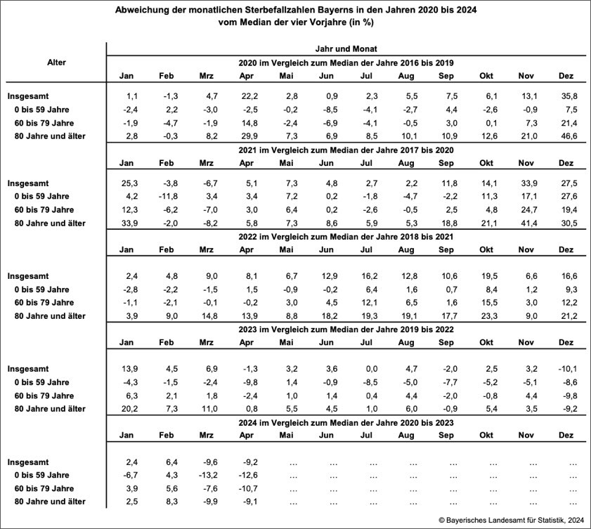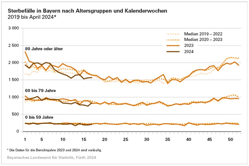 "Die Auswertung vorläufiger Daten zum April 2024 zeigt für alle Alters-Gruppen Sterbefall-Zahlen unterhalb des Medians der Vorjahre", teilte das Landesamt für Statistik weiter mit. Bei Personen im Alter von unter 60 Jahren verzeichnete die Behörde im April dieses Jahres einen Rückgang der Sterbefälle um zirka 13 Prozent. Bei der Gruppe der 60-Jährigen bis Unter-80-Jährigen sowie bei den 80-Jährigen und Älteren lagen die Sterbefall-Zahlen um etwa elf Prozent beziehungsweise um neun Prozent unter dem Median der Jahre 2020 bis 2023.