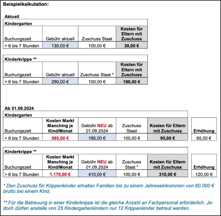 (ty) Die Gemeinde Manching wird zum 1. September die Gebühren für die Betreuung von Buben und Mädchen in den kommunalen Kindergärten und Krippen merklich erhöhen. Das hat der Gemeinderat in seiner Sitzung am gestrigen Abend einstimmig beschlossen. Mit dieser Maßnahme "soll dem jährlichen Fehlbetrag im Haushalt entgegengewirkt werden", fasst man im Rathaus zusammen. Das für heuer kalkulierte Defizit in Höhe von zwei Millionen Euro sei größtenteils durch die in den vergangenen Jahren gestiegenen Personal-Kosten entstanden. Seit der Gebühren-Kalkulation aus dem Jahre 2020 seien die Gesamt-Kosten für die Gemeinde um mehr als 64 Prozent geklettert. Nachfolgend die Details, die künftigen Gebühren sowie eine Beispiel-Rechnung.