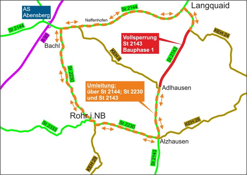 "In der ersten Bauphase wird von der Einmündung der KEH8 bei Adlhausen bis zur Einmündung der KEH24 der Asphalt-Oberbau verstärkt", erklärt das staatliche Bauamt. "Im Anschluss daran wird in der zweiten Bauphase vom Anschluss Staatsstraße 2144 bei Langquaid bis zur KEH8 bei Adlhausen eine neue Deckschicht eingebaut." Während der ersten Bauphase verlaufe die Umleitung wie folgt: Von der Staatsstraße 2143 gehe es auf die Staatsstraße 2230 über Rohr in Richtung Bachl, hier weiter auf die Staatsstraße 2144 in Richtung Langquaid und dann zurück auf die Staatsstraße 2143. Die Umleitung gelte analog in die entgegengesetzte Richtung. Die Umleitungs-Empfehlung für die zweite Bauphase werde rechtzeitig bekannt gegeben.