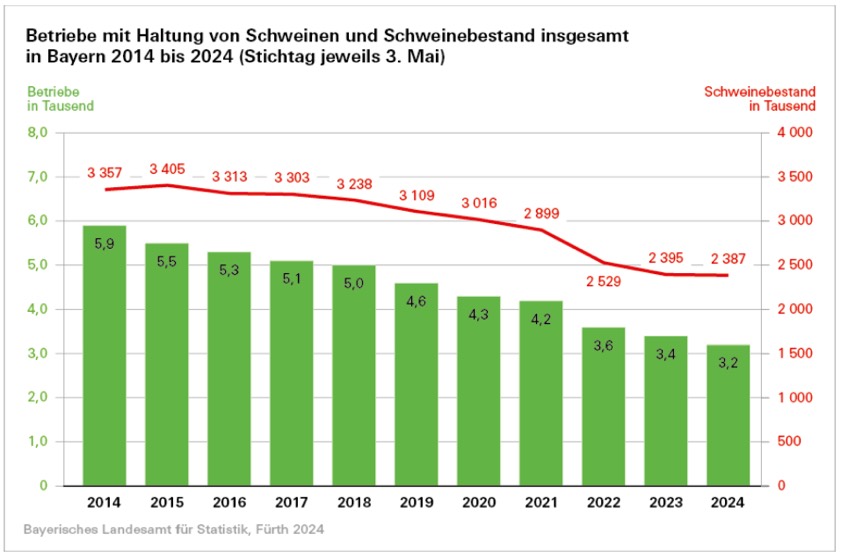 Die durchschnittliche Bestands-Größe in Bayern ist seit Mai vergangenen Jahres von 709 auf 737 Tiere pro Betrieb gestiegen. In den vergangenen zehn Jahren hat sich die Zahl der Schweine haltenden Betriebe in Bayern fast halbiert; zu Buche steht ein Minus von 45,8 Prozent. Der Schweine-Bestand ist seit dem Jahr 2014 dagegen nur um etwa 29 Prozent zurückgegangen.
