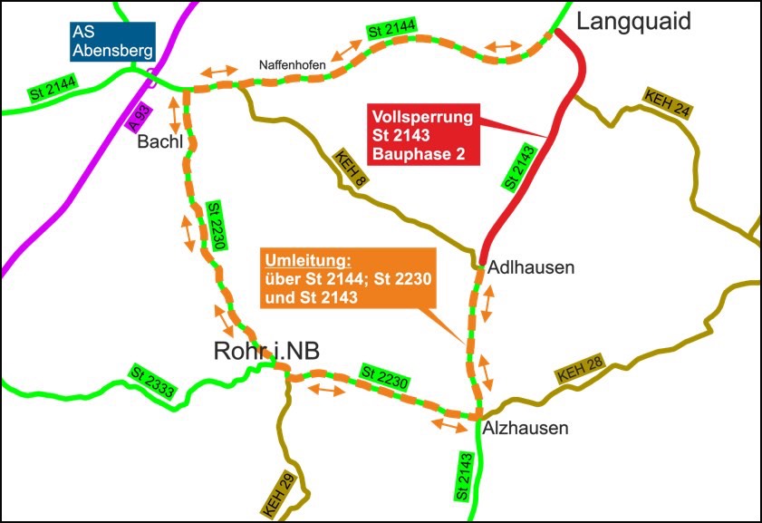 Denn dafür wird laut Ankündigung des staatlichen Bauamts die aktuelle Vollsperrung auf der Staatsstraße 2143 in Richtung Norden um eine Länge von zirka 1,3 Kilometern bis zur Einmündung in die Staatsstraße 2144 bei Langquaid erweitert. Die großräumige Umleitung bleibe weiterhin bestehen. Die Strecke verlaufe wie folgt: Von der Staatsstraße 2143 auf die Staatsstraße 2230 über Rohr in Richtung Bachl, weiter auf die Staatsstraße 2144 in Richtung Langquaid. Die Umleitung erfolge analog in der entgegengesetzten Richtung. Bis August solle diese Maßnahme abgeschlossen sein. Sie werde mit 850 000 Euro aus dem Staatshaushalt finanziert und von der Firma Swietelsky aus Biburg umgesetzt.