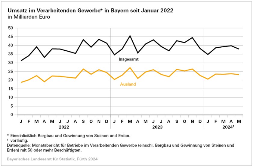 (ty) Im Mai dieses Jahres hat das verarbeitende Gewerbe im Freistaat ein Umsatz-Minus von nominal 7,3 Prozent gegenüber dem Vorjahres-Monat verzeichnet – und zwar auf rund 37,9 Milliarden Euro. Das verarbeitende Gewerbe, bezogen auf Betriebe mit 50 oder mehr Beschäftigten, umfasst hierbei auch immer den Bergbau und die Gewinnung von Steinen und Erden. Wie das Landesamt für Statistik weiter mitteilte, entfielen von den 37,9 Milliarden Euro des Gesamt-Umsatz rund 23,2 Milliarden Euro auf Umsätze mit dem Ausland (minus 6,1 Prozent) und darunter rund 7,3 Milliarden Euro auf Umsätze mit den Ländern der Eurozone (minus 5,5 Prozent).
