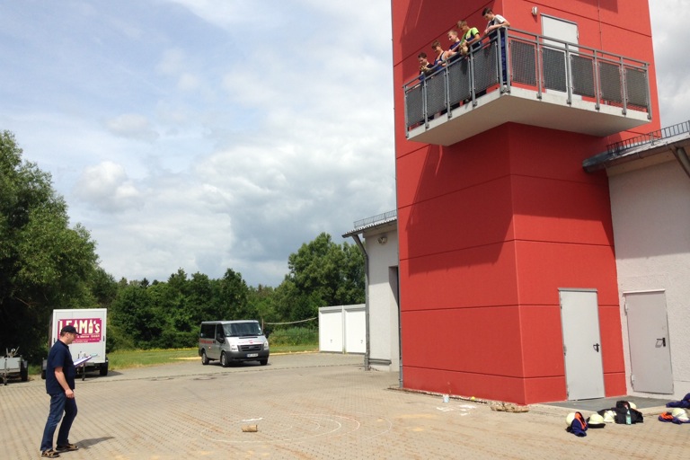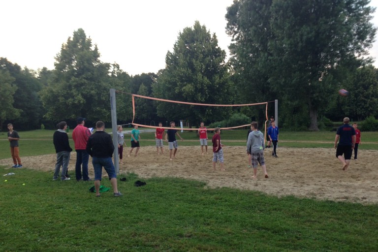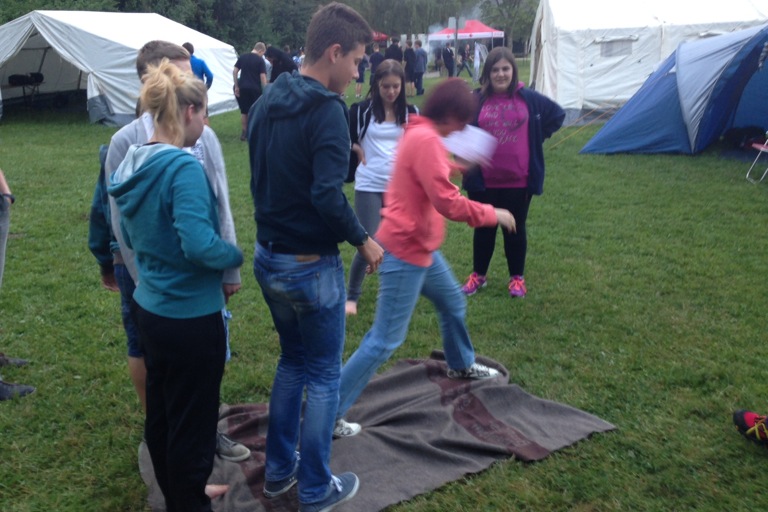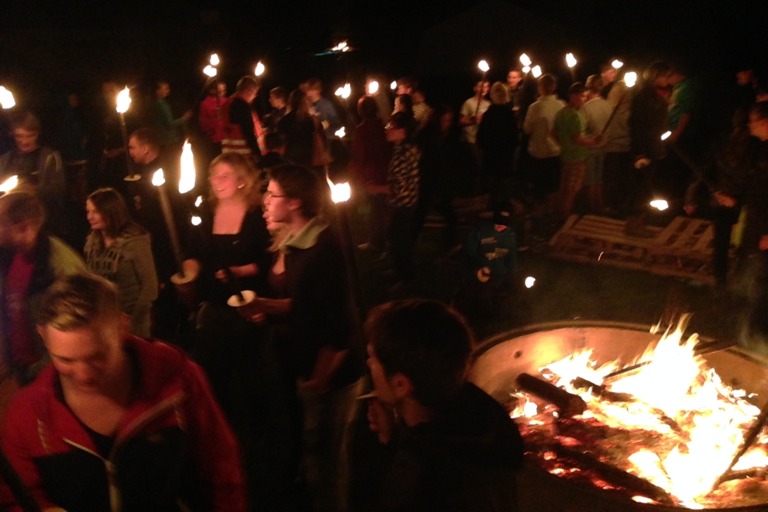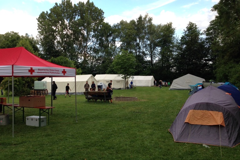 Gestern standen nach der Anreise und dem Aufbau des Lagers ein Volleyball-Turnier, Getränkekisten-Stapeln und ein Staffellauf auf der Agenda, ehe es dann noch eine Nachtwanderung mit Fackeln gab. Der Tag klang dann am Lagerfeuer mit Girarrenmusik aus.