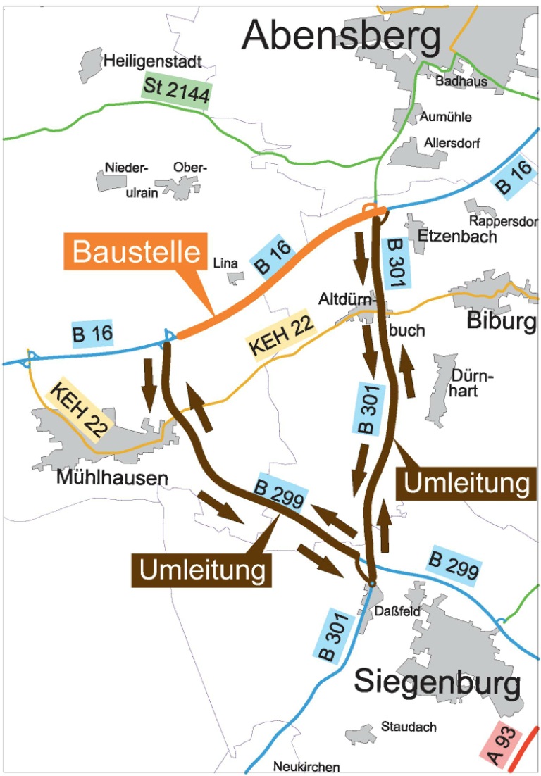 In der ersten Bauphase wird die B16 zwischen dem Anschluss B 299 bei Mühlhausen und dem Anschluss B301 bei Abensberg komplett für den Verkehr gesperrt. Die Knotenpunkte der B16 mit der B299 bei Mühlhausen und der B16 mit der B301 bei Abensberg bleiben weiterhin befahrbar. Die Umleitungsstrecke verläuft in beiden Fahrtrichtungen über die B299 bis Siegenburg und weiter auf der B301 nach Abensberg. Die Umleitungsstrecke werden entsprechend ausgeschildert.