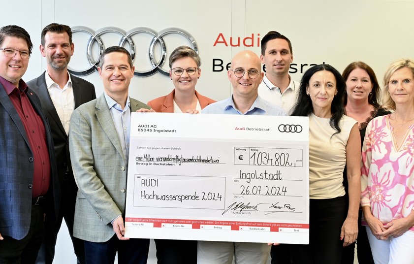 "Nachdem die Überflutungen Ende Mai und Anfang Juni 2024 zahlreiche Landkreise in Bayern und Baden-Württemberg stark getroffen hatten, riefen der Audi-Gesamt-Betriebsrat und der Vorstand die Belegschaft zu einer freiwilligen Spenden-Aktion auf", erklärt das Unternehmen zum Hintergrund. Mehr als 3000 Audi-Angestellte aus Ingolstadt und Neckarsulm seien dem Aufruf gefolgt. Durch ihre Spenden seien insgesamt 284 800 Euro zusammengekommen. Das Unternehmen habe die Belegschafts-Spende mit 750 000 Euro bezuschusst, sodass die gesamte Spenden-Summe bei mehr als einer Million Euro liege.