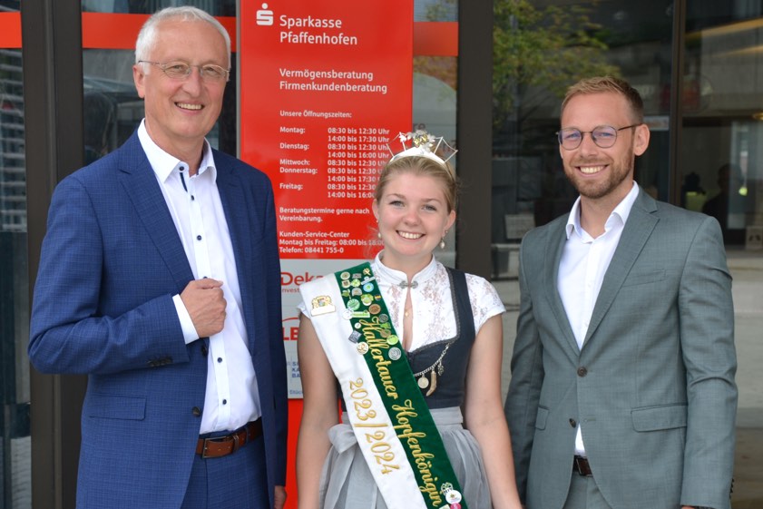 (ty) Über majestätischen Besuch hat man sich kürzlich bei der Sparkasse in Pfaffenhofen freuen dürfen. Die amtierende Hallertauer Hopfenkönigin, Lena Schmid, stattete den Firmenkunden-Beratern des Geldinstituts in der Kreisstadt einen Besuch ab. Offiziell empfangen wurde sie dabei von Abteilungs-Leiter Ludwig Ferstl und Firmenkunden-Berater Michael Mößnang (Foto oben).