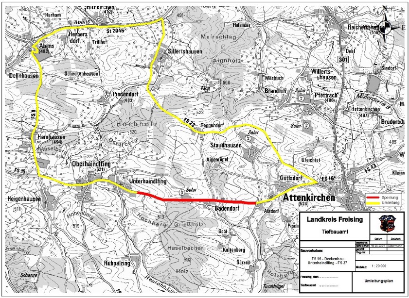 (ty) Der Kreis Freising saniert die Fahrbahn der Kreisstraße FS16 zwischen dem Ortsausgang von Unterhaindlfing und der Abzweigung der FS27 bei Alsdorf. Die Maßnahme umfasst nach Angaben des Landratsamts das Aufbringen einer Asphalt-Deckschicht im Kalteinbau sowie die Erneuerung der Markierung. Die Arbeiten starten laut Behörde am kommenden Montag, 5. August, und dauern voraussichtlich bis 16. August. In diesem Zeitraum sei die Strecke für den gesamten Verkehr komplett gesperrt; es werde großräumig umgeleitet.