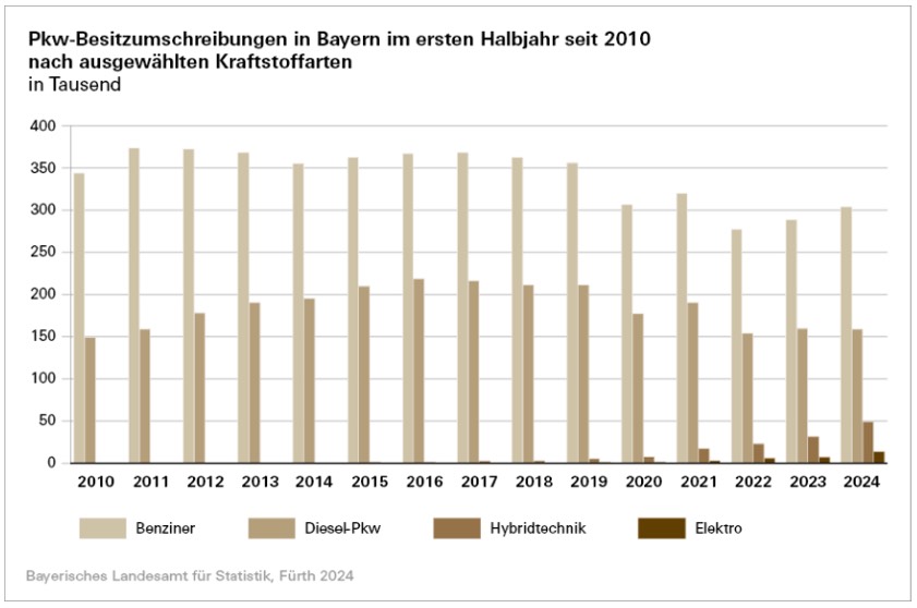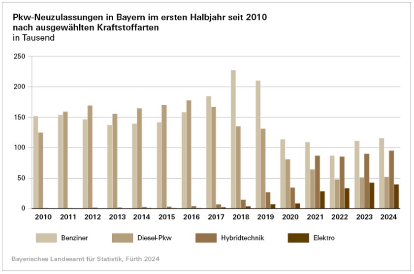 Im ersten Halbjahr nutzen mehr als 55 Prozent der im Freistaat neu zugelassenen Pkw die klassischen Verbrennungs-Motoren Benzin oder Diesel. Bei den alternativen Antriebsarten verzeichnete die Hybrid-Technik ein Plus von 5,7 Prozent, wobei hierunter die Plug-In-Technologie besonders stark um 20,7 Prozent auf 17 653 Fahrzeuge anstieg. Reine Elektro-Autos (BEV) fielen hingegen um 6,8 Prozent auf 39 808 Neuzulassungen. Außerdem wurden 30,0 Prozent mehr Lastkraftwagen und 9,1 Prozent mehr Kraftomnibusse von Januar bis Juni dieses Jahres neu zugelassen als im Vorjahres-Zeitraum. Die Zulassungs-Zahlen bei Zugmaschinen sanken um 2,1 Prozent, die bei Krafträdern fielen um 1,8 Prozent.