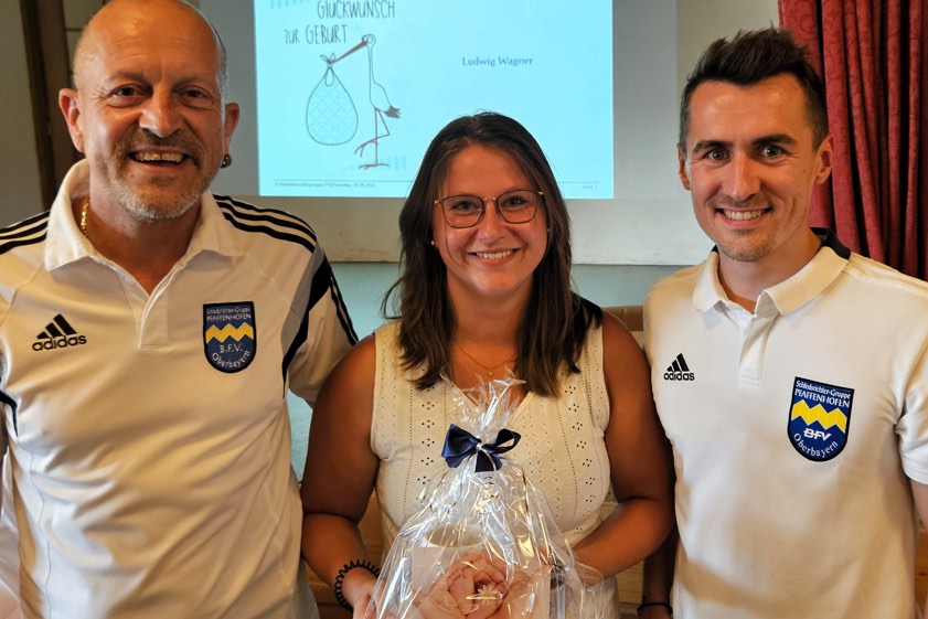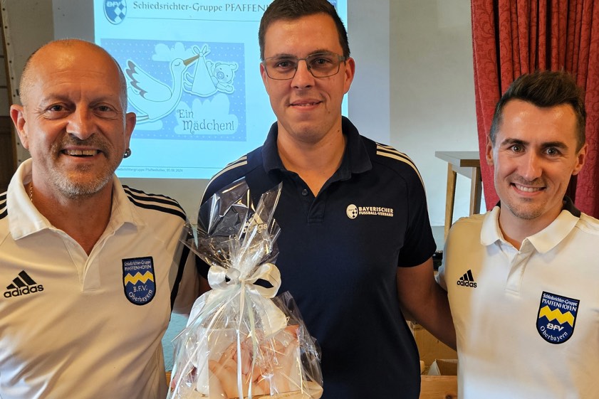 (ty) Im Namen der gesamten Fußball-Schiedsrichter-Gruppe von Pfaffenhofen haben der amtierende Obmann Michael Seidl und sein Stellvertreter Fabian Anders bei der jüngsten Zusammenkunft der hiesigen Unparteiischen auch Glückwünsche aussprechen dürfen. Denn es gab Nachwuchs! Die beiden gratulierten ihrer Referee-Kameradin Alexandra Wagner, geborene Steinmeier, zu ihrem Sohn Ludwig. Ebenfalls Nachwuchs bekommen hat Schiri-Kamerad Tobias Weber: Ihm gratulierten die beiden Obmänner zur Geburt seiner Tochter Anna.