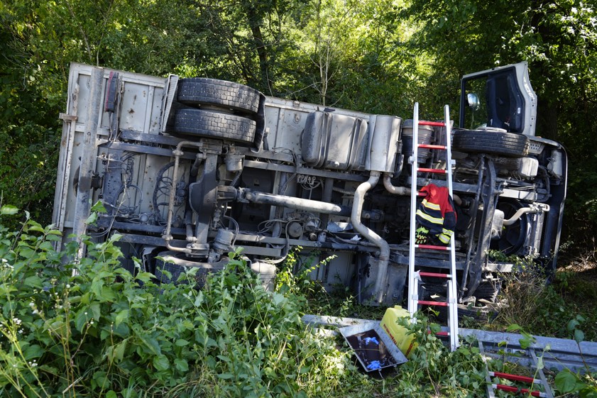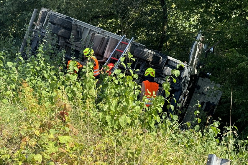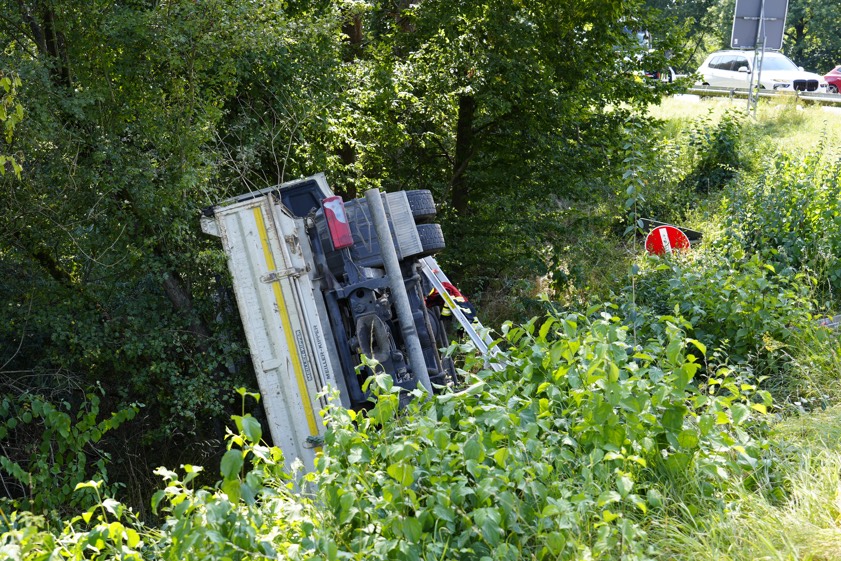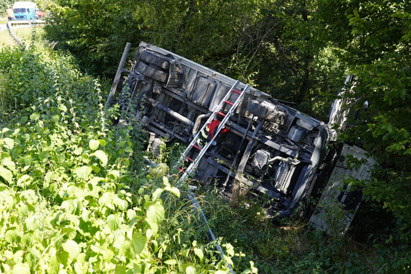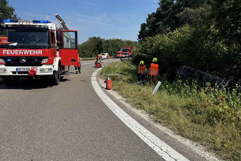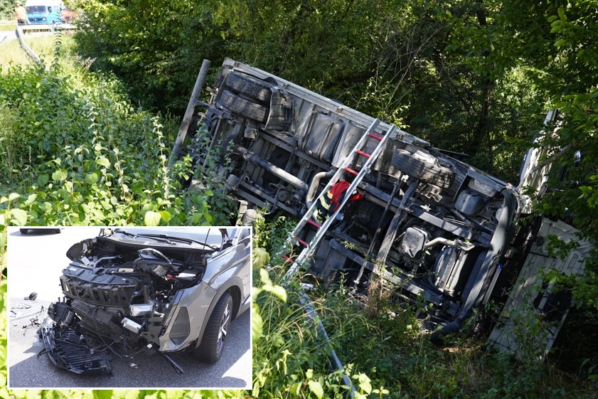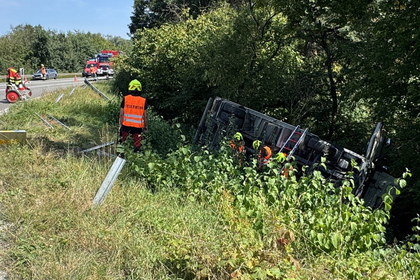 Der Lkw durchbrach laut Polizei die Leitplanke und kippte in der abfallenden Böschung auf die linke Seite um. Beide Fahrer seien vom Rettungsdienst versorgt worden. Der Unfall-Verursacher habe angegeben, dass er unverletzt geblieben sei. Der Lkw-Fahrer habe eine Kopf-Platzwunde davongetragen und sei dann in einem Krankenhaus nochmals untersucht worden. Sowohl der Pkw als auch der Kleinlaster mussten abgeschleppt werden. Im Einsatz waren auch mehrere Feuerwehren.