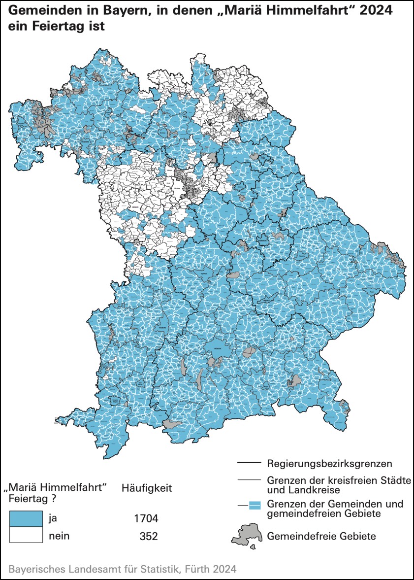 Laut Landesamts für Statistik ist das Fest "Mariä Himmelfahrt" somit heuer in 1704 von insgesamt 2056 bayerischen Gemeinden ein gesetzlicher Feiertag. In Oberbayern und Niederbayern sei der 15. August in diesem Jahr überall ein Feiertag, weil dort in allen Gemeinden zum Stichtag des Zensus 2011 die Zahl der Katholiken überwogen habe. Auch in der Oberpfalz (96,0 Prozent der Gemeinden überwiegend katholisch), in Schwaben (95,3 Prozent) sowie in Unterfranken (87,0 Prozent) haben die meisten Menschen an diesem Tag frei. In der Mehrheit der Gemeinden der evangelisch geprägten Regierungsbezirke Oberfranken und Mittelfranken sei "Mariä Himmelfahrt" hingegen kein Feiertag: Dort seien nur 46,3 Prozent beziehungsweise 18,1 Prozent der Gemeinden mehrheitlich katholisch.