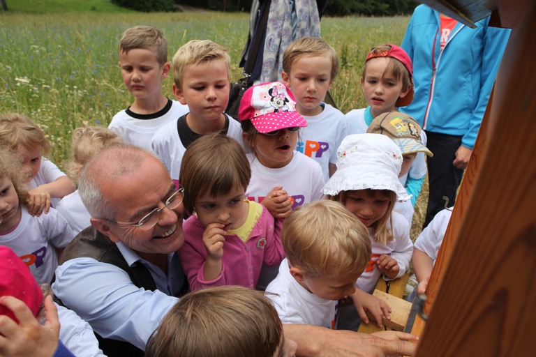 (ty) Für den Gedanken der Nachhaltigkeit nahm Prof. Claus Hipp heut Vormittag auch Regen während seiner Eröffnungsrede in Kauf. „Ich bin wetterfest“, sagte er nur. Viel wichtiger war nämlich, den rund 160 Buben und Mädchen des Kindergartens „Arche Noah“ in Pfaffenhofen von der für uns Menschen lebenswichtigen Funktion der Arbeit der Bienen zu erzählen. Im Rahmen der Nachhaltigkeitswochen veranstaltete Hipp heute die Kinder-Mitmachaktion. Sowohl Kindergarten- als auch Hipp-Mitarbeiterkinder konnten dabei heute spielerisch vieles über die Arbeit der Bienen lernen.