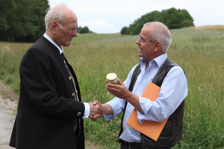 Thomas Radetzki, Imkermeister und geschäftsführender Vorstand vom Mellifera, überreichte Claus Hipp eine Urkunde für seine „Bienenpatenschaft“. Damit erhob er den geschäftsführenden Gesellschafter der Hipp-Gruppe sozusagen zum Ehrenpaten. „Beste Qualität in der Babynahrung kann man nur herstellen, wenn die Bienen eine ideale Grundlage für ihre Arbeit vorfinden“, heißt es dazu aus dem Unternehmen.