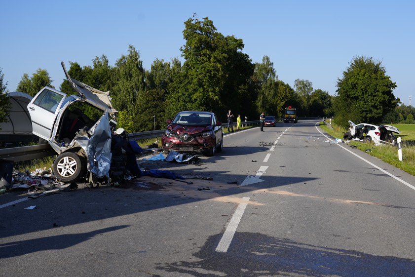 (ty) Einen Toten, zwei Schwerverletzte und zwei Leichtverletzte hat ein heftiger Verkehrsunfall gefordert, der sich am gestrigen Nachmittag gegen 16.25 Uhr auf der B300 auf Höhe von Schrobenhausen ereignet hat. Ein 59-Jähriger geriet mit seinem Pkw auf die Gegenspur, woraufhin es zum Zusammenstoß mit dem Auto eines 71-Jährigen kam. Für den Senior kam jede Hilfe zu spät. Der Crash-Verursacher und dessen ebenfalls 59 Jahre alte Ehefrau erlitten jeweils schwere Verletzungen. Ein 74-Jähriger und eine 66-Jährige prallten mit einem Auto in die Unglücksstelle und wurden jeweils leicht verletzt. Die Bundesstraße war für rund vier Stunden komplett gesperrt.
