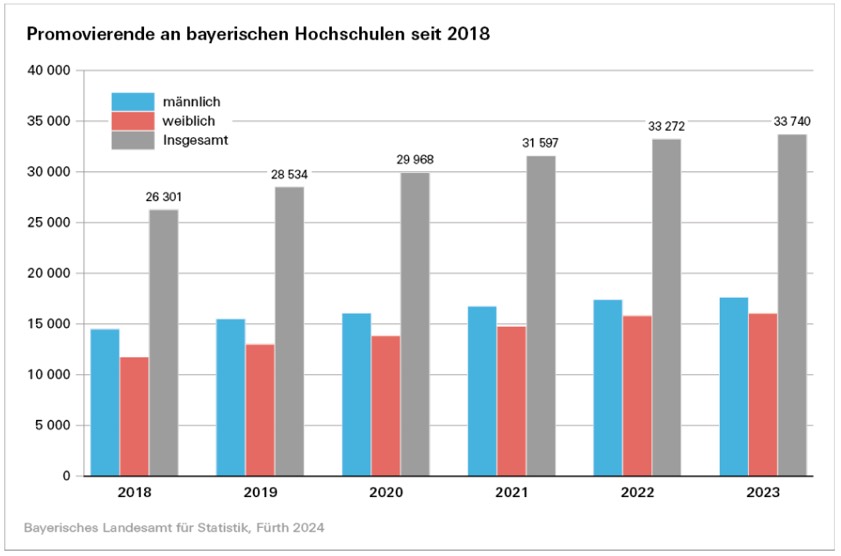 (ty) Wie das bayerische Landesamt für Statistik jetzt mitgeteilt hat, waren im vergangenen Jahr an den Hochschulen im Freistaat insgesamt 33 740 Promovierende mit ihrer Dissertation befasst – davon 16 064 Frauen. Der Frauen-Anteil lag damit bei 47,6 Prozent. Insgesamt am häufigsten strebten die promovierenden Personen eine Promotion in der Fächer-Gruppe "Human-Medizin / Gesundheits-Wissenschaften" (27,3 Prozent) an, gefolgt von Mathematik, Natur- (23,2 Prozent) und Ingenieur-Wissenschaften (20,3 Prozent).