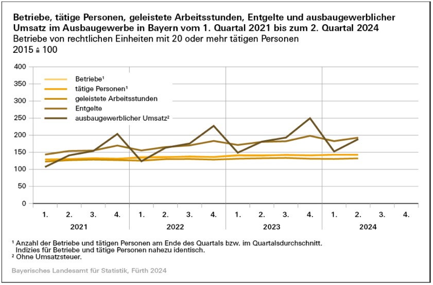 Nach regionaler Betrachtung auf Ebene der Regierungsbezirke entfiel gut ein Drittel des Umsatzes auf die Betriebe mit Sitz in Oberbayern. Die 663 dort ansässigen Ausbau-Gewerbe-Firmen erzielten mit 1,23 Milliarden Euro ein durchschnittliches Plus von nominal 1,0 Prozent gegenüber dem zweiten Quartal vergangenen Jahres. In den übrigen sechs Regierungsbezirken konnten die Ausbau-Gewerbe-Betriebe im Mittel ihre ausbau-gewerblichen Umsätze gegenüber dem Vorjahres-Quartal zwischen 1,5 Prozent in Niederbayern und 19,5 Prozent in Oberfranken steigern.
