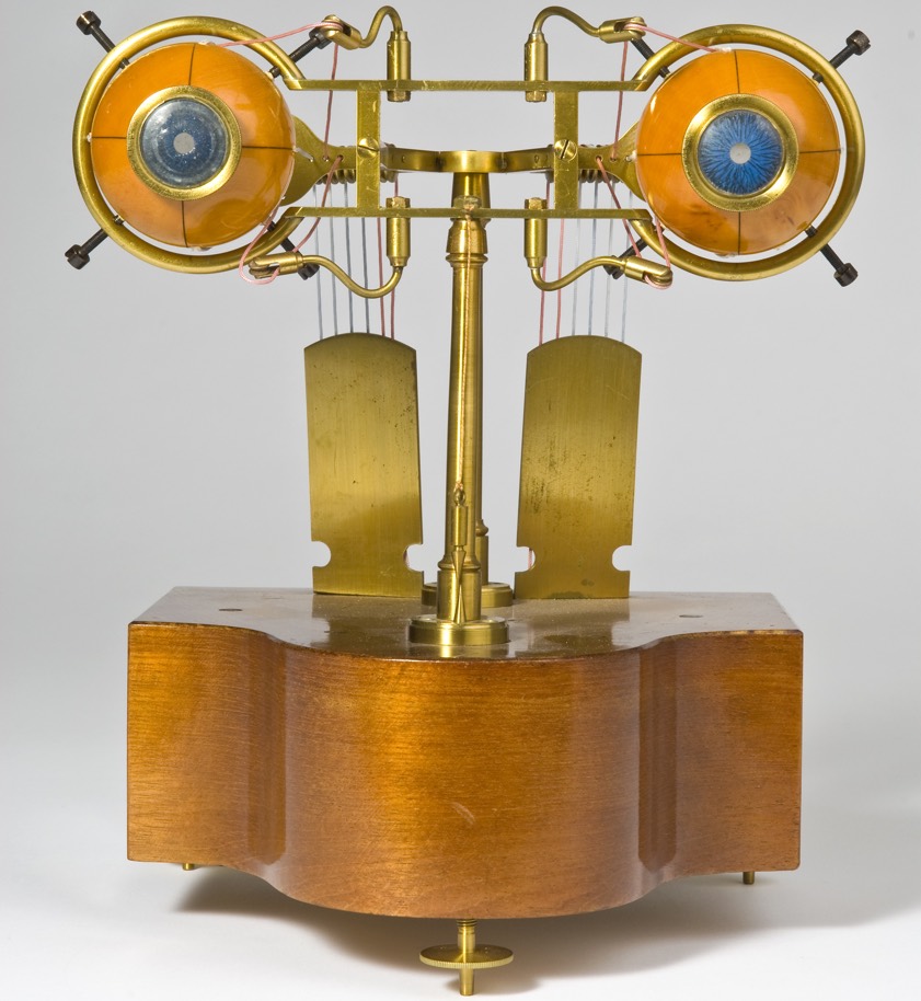 Nicht so das "Ophthalmotrop" (wörtlich: Augenwender) nach Christian Georg Ruete (1810 bis 1867) aus dem Jahre 1857. Hier genügt ein Blick, und schon erkennt man, dass hier ein Augen-Paar nachgebaut wurde. Aber was hat es mit den merkwürdigen Schnüren auf sich, die an den beiden hölzernen Augäpfeln angebracht sind? Und warum hängen daran kleine Gewichte? Unter anderem das gibt es am Dienstag zu erfahren. (Foto: DMMI, Michael Kowalski)