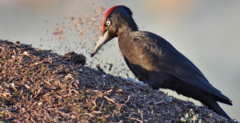 Der etwa krähengroße Schwarzspecht (Dryocopus martius) bewohne am liebsten Mischwälder mit altem Baum-Bestand. Im Freistaat liegen seine Verbreitungsschwerpunkt laut LBV in Mittel- und Unterfranken. Dieser Vogel sei leicht zu erkennen: Er sei der größte heimische Specht und sein Gefieder sei bis auf einen tiefroten Mittelscheitel komplett schwarz. Er fresse baumbewohnende Insekten und deren Larven. Seine Bruthöhle mit ovalem Loch hämmere er mit spitzem Schnabel bevorzugt in den Stamm alter Buchen. Er sei der Zimmermann des Waldes, denn seine Höhlen würden von über 60 verschiedenen "Nachmietern" genutzt, unter anderem von Siebenschläfer, Fledermaus und Hohltaube. "Trommeln für Vielfalt!" laute darum sein Wahl-Slogan.