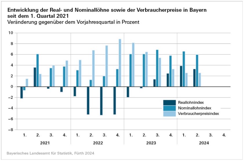 (ty) Die Nominallöhne der Arbeitnehmerinnen und Arbeitnehmer im Freistaat sind im zweiten Quartal heuer um durchschnittlich 6,0 Prozent gegenüber dem Vorjahres-Zeitraum gestiegen. Die Verbraucher-Preise nahmen indes im Vergleich zum zweiten Quartal des Vorjahres um 2,6 Prozent zu. Wie das bayerische Landesamt für Statistik weiter mitteilt, errechnete sich für die Reallöhne im Freistaat im zweiten Quartal dieses Jahres ein Zuwachs um 3,3 Prozent. Somit kam es für die bayerischen Beschäftigten bereits das vierte Quartal in Folge zu einem Anstieg der Reallöhne. Maßgeblich für die jüngste positive Entwicklung seien Auszahlungen der Inflations-Ausgleichs-Prämie sowie die unter anderem in Tarif-Verträgen beschlossenen Lohnsteigerungen und Einmal-Zahlungen.