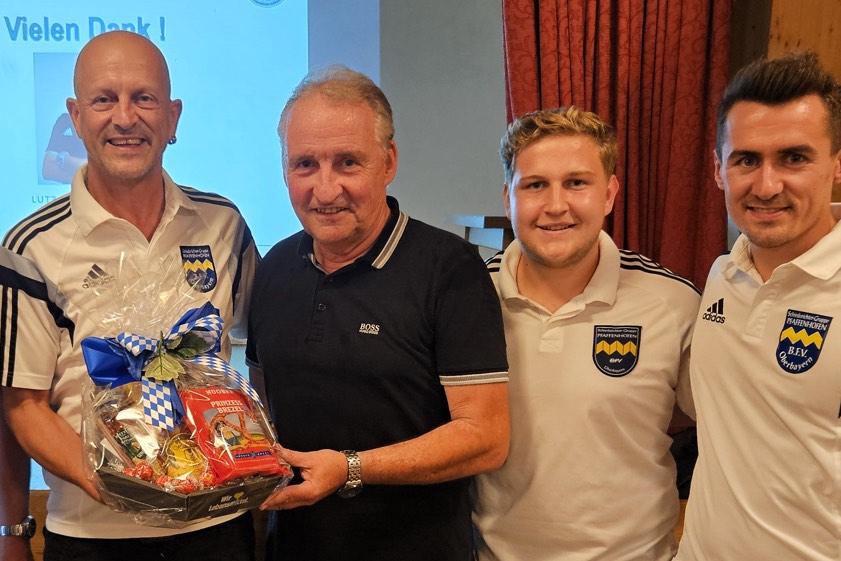 DFB-Lehrwart Lutz Wagner (Zweiter von links) bekam von Michael Seidl (links), dem Obmann der Pfaffenhofener Fußball-Schiri-Gruppe, einen Geschenkkorb überreicht. Mit auf dem Bild: Der hiesige Schiri-Lehrwart Niklas Großmann und der Pfaffenhofener Vize-Schiri-Obmann Fabian Anders.