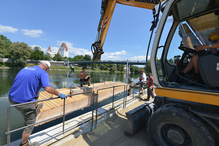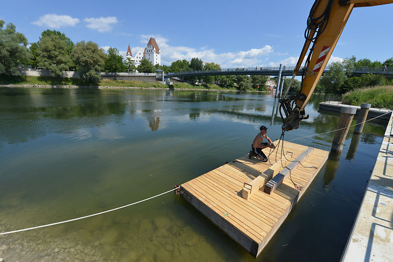 Heute wurde die schwimmende Chill-Arena in die Donau vor der Bühne eingesetzt – In Betrieb geht das Floß wegen der TÜV-Abnahme aber erst kommenden Mittwoch
