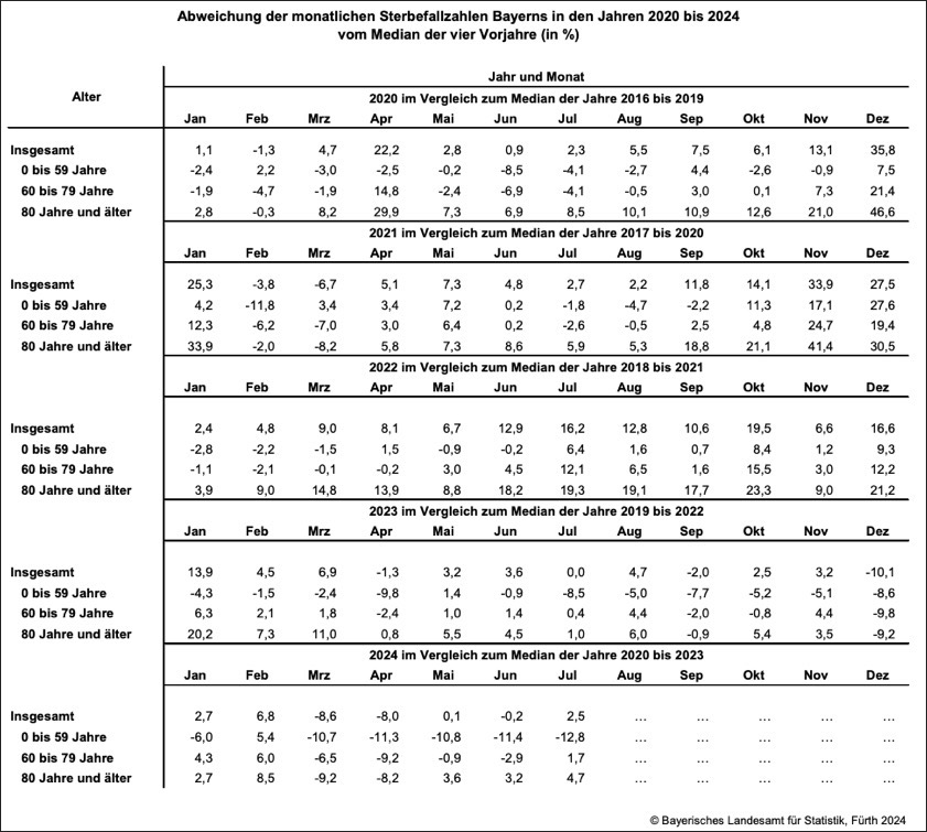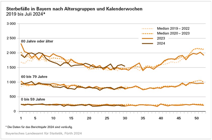 Bei Personen im Alter von unter 60 Jahren verzeichnete das bayerische Landesamt für Statistik im Juli des laufenden Jahres nach eigenem Bekunden einen Rückgang der Sterbefälle um zirka 13 Prozent. Bei der Gruppe der 60-Jährigen bis Unter-80-Jährigen lagen die Sterbefall-Zahlen im Freistaat um etwa zwei Prozent, bei der Gruppe der 80-Jährigen und Älteren knapp fünf Prozent über dem Median der Jahre 2020 bis 2023.
