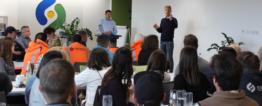 Das Foto entstand bei einer Mitarbeiter-Versammlung am gestrigen Tag: Rechts vorne steht Stefan Eisenmann, neben ihm Thomas Wiringer.