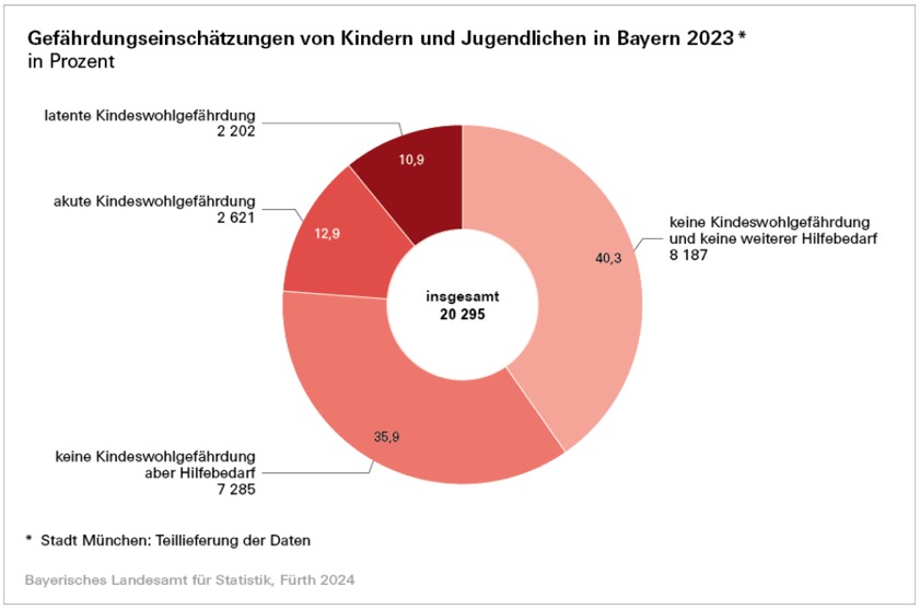 (ty) Wie das bayerische Landesamt für Statistik bekannt gegeben hat, wurden im vergangenen Jahr im Freistaat insgesamt 20 295 Verfahren zur Einschätzung der Gefährdung des Kindeswohls durchgeführt. Betroffen waren 10 584 Jungen und 9711 Mädchen. Insgesamt ergaben 2621 Gefährdungs-Einschätzungen (12,9 Prozent) eine akute und 2202 (10,9 Prozent) eine latente Kindeswohl-Gefährdung. Dabei waren Anzeichen für eine Vernachlässigung oder eine psychische oder körperliche Misshandlung die häufigsten Gründe einer Kindeswohl-Gefährdung.
