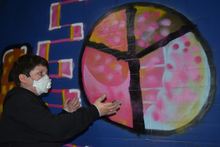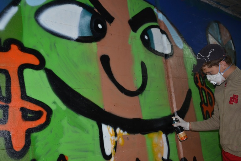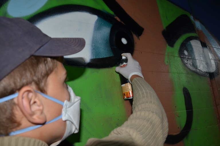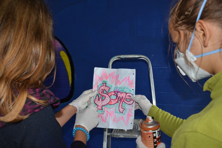 Unter der theoretischen und praktischen Anleitung von Andi Dill überlegten sich die Workshop-Teilnehmer zunächst Motive und fertigten danach Skizzen von den angedachten Kunstwerken. Dill, der selbst auf zahlreichen Flächen in der Stadt mit gesprühten Werken präsent ist, erläuterte die Handhabung der Dosen, gab Tipps, verriet Tricks und erläuterte, worauf man achten muss beim Sprühen. Übrigens trugen auch alle einen Mundschutz, damit die Farbdämpfe nicht eingeatmet werden.