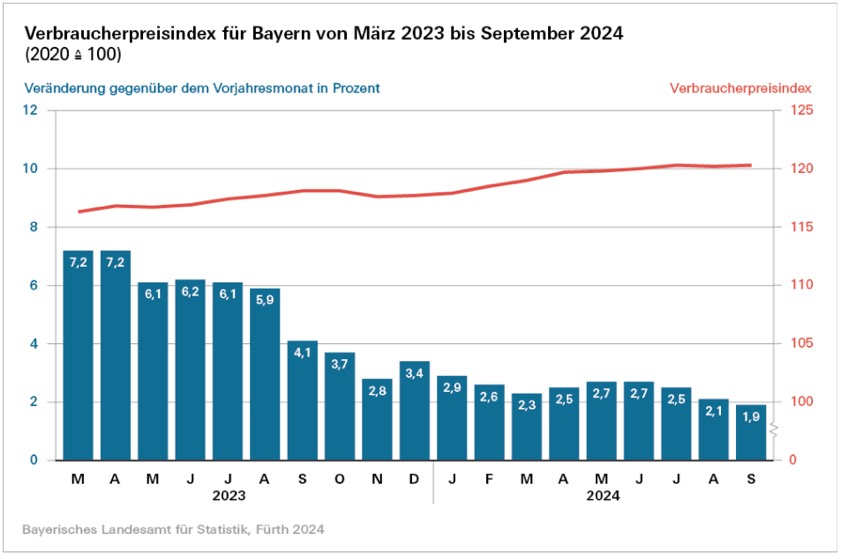 (ty) Im Freistaat sind die Verbraucher-Preise im zu Ende gehenden September gegenüber dem Vorjahres-Monat um 1,9 Prozent gestiegen. Das teilte das bayerische Landesamt für Statistik heute mit. Unter zwei Prozent lag die Veränderungsrate zum Vorjahres-Monat nach Angaben der Behörde zuletzt vor mehr als drei Jahren – für den März 2021 steht ein Plus von 1,8 Prozent zu Buche. Nahrungsmittel kosten aktuell 1,6 Prozent mehr als im Vorjahr. Energie kann hingegen 6,8 Prozent günstiger bezogen werden. Zum Beginn des Oktoberfests verzeichnen die Experten eine Preissteigerung für ein Bier im Restaurant oder Café von 2,9 Prozent. Ein Fleischgericht im Restaurant oder Café wurde sogar um 7,3 Prozent teurer. Bei Butter ist ein massiver Preisanstieg von 24,2 Prozent zu beobachten.