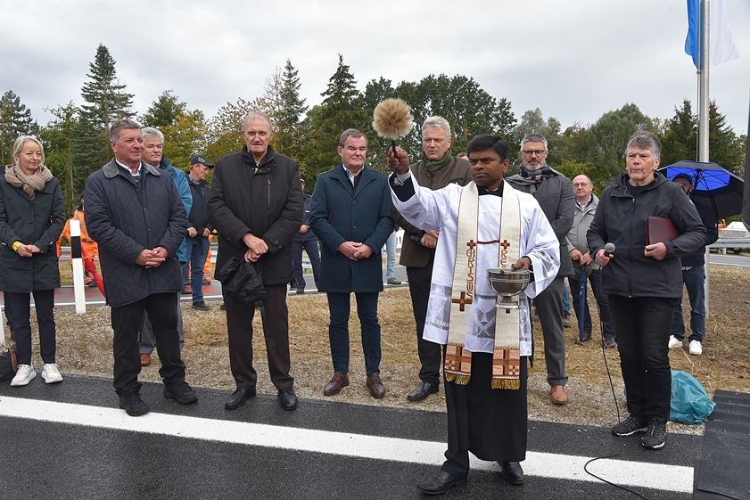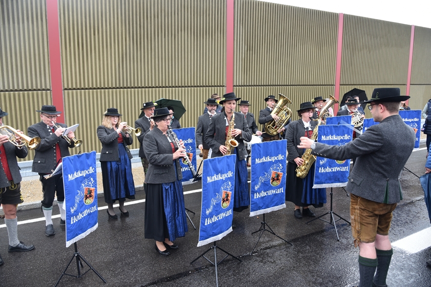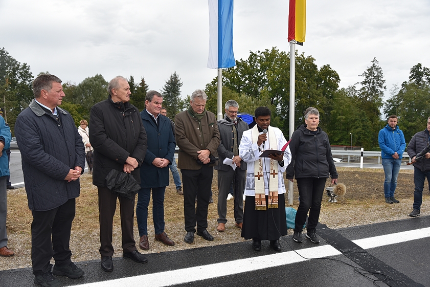 Die Segnung der B300-Ortsumfahrung übernahm heute Kaplan Peter Gaddam von der Pfarreien-Gemeinschaft Hohenwart-Tegernbach. Anwesend waren unter anderem auch der Pfaffenhofener Landrat Albert Gürtner (FW), der Landtags-Abgeordnete Roland Weigert (FW) aus dem Nachbar-Landkreis Neuburg-Schrobenhausen und Helmut Bergwinkel (FUW), der Bürgermeister von Pörnbach. Zur Feier des Tages spielte sogar die Marktkapelle von Hohenwart auf. Und natürlich wurde von Bernreiter & Co. anlässlich der Verkehrs-Freigabe auch ein Band durchschnitten.