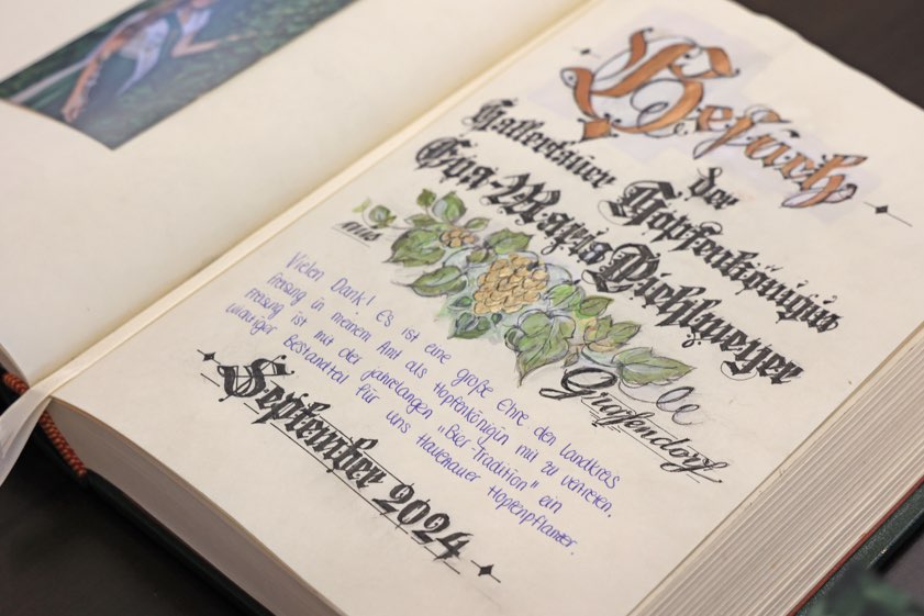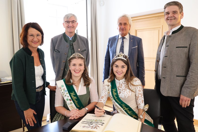 Die neue Hopfenkönigin Eva-Maria Pichlmeyer und Vize-Queen Anna Fischer trugen sich ins Goldene Buch ihres Heimat-Landkreises Freising ein.