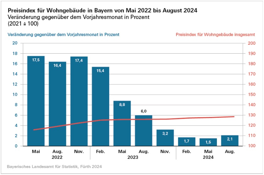 Die Preise für den Neubau von Wohngebäuden lagen in Bayern im August heuer also um durchschnittlich 2,1 Prozent höher als ein Jahr zuvor. Im Mai dieses Jahres hatte die Steigerungsrate gegenüber dem Vorjahr noch 1,5 Prozent betragen. "Nach der überaus dynamischen Preisentwicklung, die seit Mitte 2021 mit Preissprüngen von über 17 Prozent zu beobachten war, stabilisieren sich aktuell die Preise – allerdings auf einem insgesamt immer noch vergleichsweise hohen Niveau", so die Statistik-Fachleute.