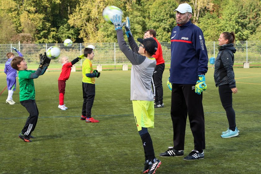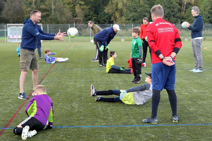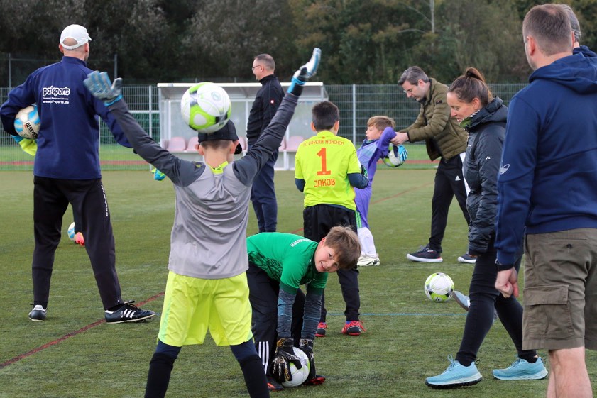 Diesbezüglich den "Trainern" und ihren Schützlingen ein paar Tipps und musterhafte Übungen an die Hand zu geben, das war das Ziel der Veranstaltung, die für alle Teilnehmer erneut kostenlos war. Den 14 Paaren, bestehend jeweils aus einem Trainer oder einer Trainerin und einem Torhüter, wurden zunächst die Aufgaben erläutert und vorgeführt, bevor sie dann von ihnen unter Aufsicht und Anleitung umgesetzt wurden. Die wesentlichen Spielsituationen eines Torwarts – das fängt beim Fangen des Balls an und reicht über das Stellungsspiel auf der Linie bis hin zum richtigen Fallen und Sichern des Balls bei hohen oder flachen Schüssen – wurden exemplarisch geübt.