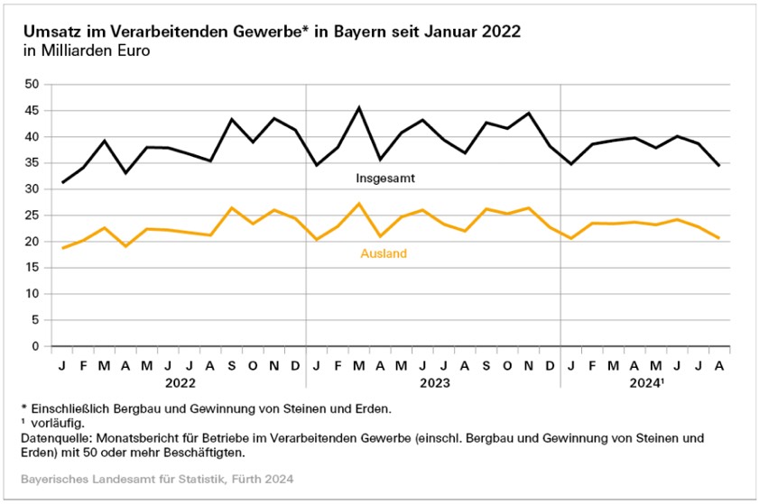 Laut Landesamt für Statistik entfielen von den 34,4 Milliarden Euro des Gesamt-Umsatzes im August rund 20,6 Milliarden Euro auf Umsätze mit dem Ausland (minus 6,2 Prozent) und darunter rund 6,4 Milliarden Euro auf Umsätze mit den Ländern der Euro-Zone (minus 2,3 Prozent). Die Anteile der Auslands-Umsätze und der Umsätze mit den Euro-Zonen-Ländern am Gesamt-Umsatz machten 60,0 beziehungsweise 18,6 Prozent aus. Die Nachfrage nach Gütern des verarbeitenden Gewerbes im Freistaat ging gegenüber dem Vorjahres-Monat preisbereinigt um 15,4 Prozent zurück. Die Bestell-Eingänge aus dem Inland (minus 21,7 Prozent) sanken dabei wesentlich stärker als die aus dem Ausland (minus 11,7 Prozent).