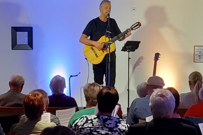 (ty) Die letzte "Zammasitzn"-Veranstaltung in Geisenfeld für dieses Jahr hat kürzlich mit Ralf Eberhardt stattgefunden. Rund 50 Gäste folgten der Einladung, sich bei traditionellen Volksliedern und Klassikern der deutschen Liedkunst aktiv zu beteiligen. Eberhardt, der den Abend mit seiner Gitarre musikalisch untermalte, lud zum Mitsingen ein – eine Aufforderung, der die Gäste begeistert nachkamen. Das vorbereitete Liederbuch bot nicht nur die Texte, sondern der Sänger selbst bereicherte die Veranstaltung mit Hintergrund-Informationen zu den einzelnen Liedern.