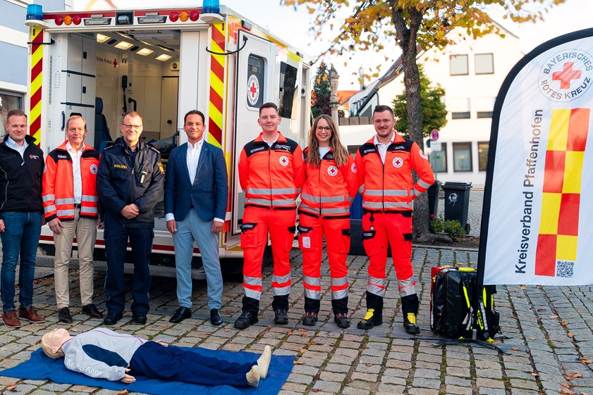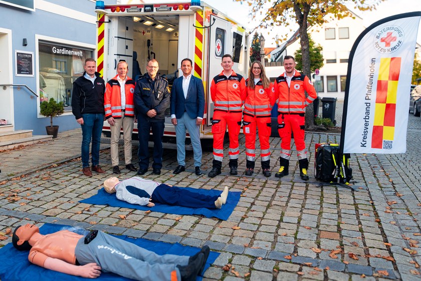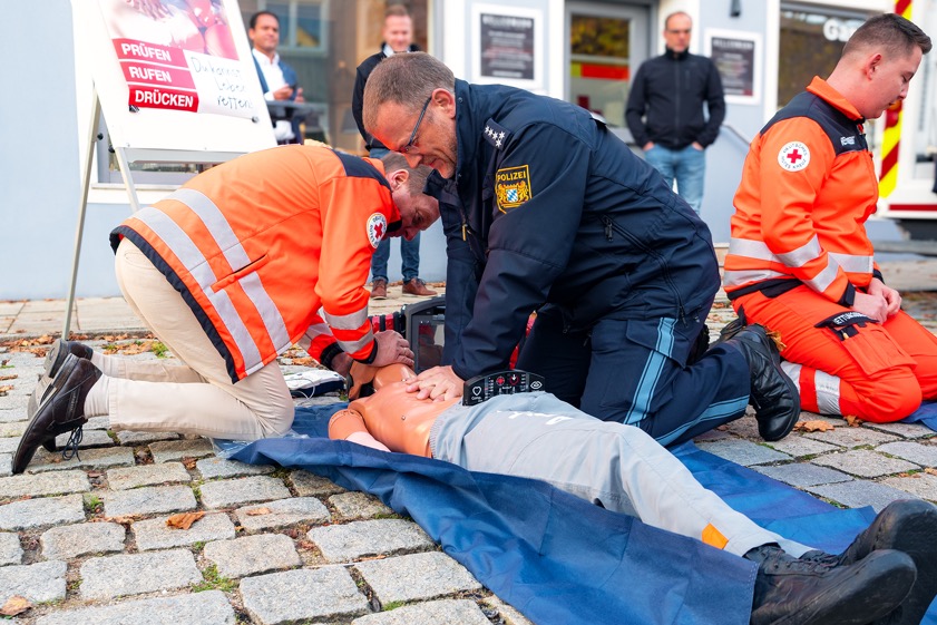 Neben Fabian Heierhoff, dem Leiter des BRK-Rettungsdienstes im Landkreis, und Michael Fochler, dem künftigen Geschäftsführer des BRK-Kreisverbands, war auch Paul Weber als Bürgermeister von Geisenfeld vor Ort. Letzterem passte seine Einsatz-Jacke aus seiner Zeit als Leiter der BRK-Rettungswache in Geisenfeld noch bestens. Auch Gesetzeshüter waren angerückt: Stefan Wallner, Leiter der Polizei-Dienststelle in Geisenfeld, und Paul Weber, Vize-Chef der Polizeiinspektion in Pfaffenhofen. Eine Laien-Reanimation verdreifacht nach BRK-Angaben die Überlebens-Chance eines Menschen bei Herz-Kreislauf-Stillstand.